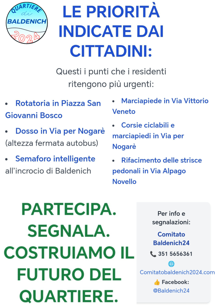 Durante l’assemblea, i cittadini hanno individuato le sei priorità più urgenti: Rotatoria in Piazza San Giovanni Bosco; Dosso in Via per Nogarè (altezza fermata autobus); Semaforo intelligente all’incrocio di Baldenich; Marciapiede in Via Vittorio VenetoCorsie ciclabili e marciapiedi in Via per Nogarè; Rifacimento delle strisce pedonali in Via Alpago Novello
