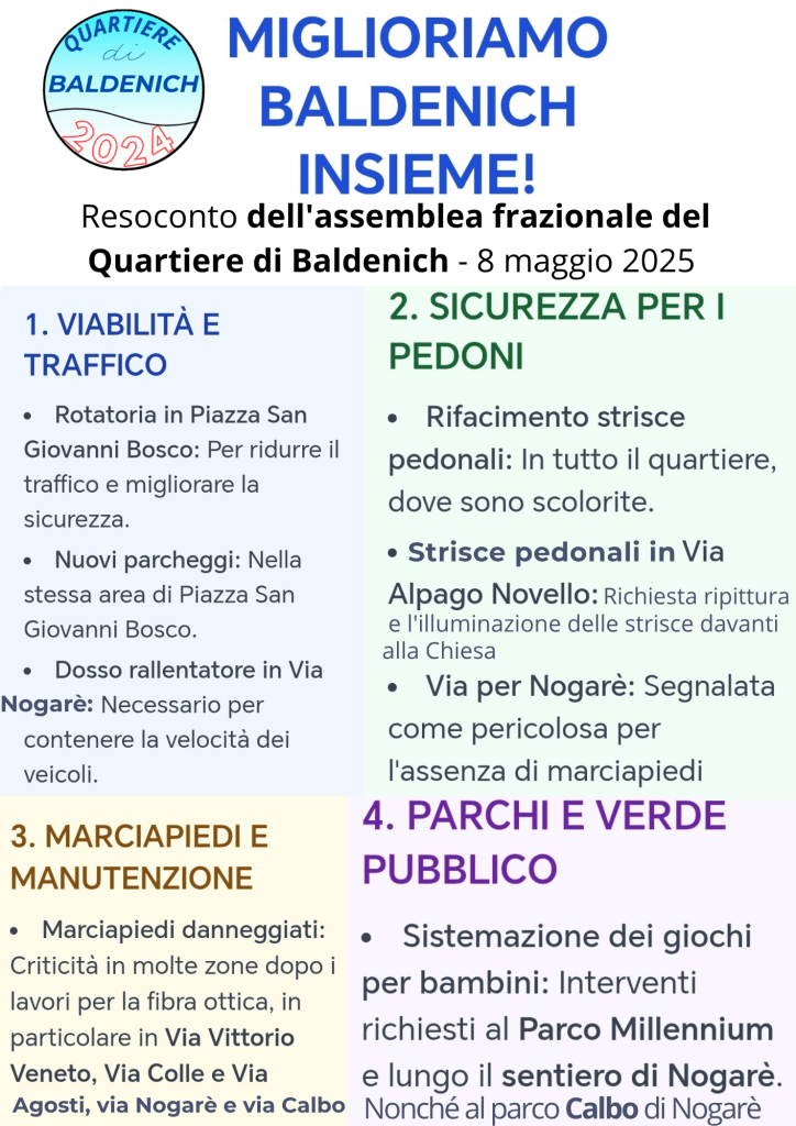 Un quartiere più vivibile, sicuro e a misura di cittadino. Questo il filo conduttore dell’assemblea frazionale organizzata dal Comitato di Quartiere Baldenich24 lo scorso 8 maggio 2025, durante la quale residenti e attivisti hanno discusso criticità, proposte e priorità per il futuro della frazione.