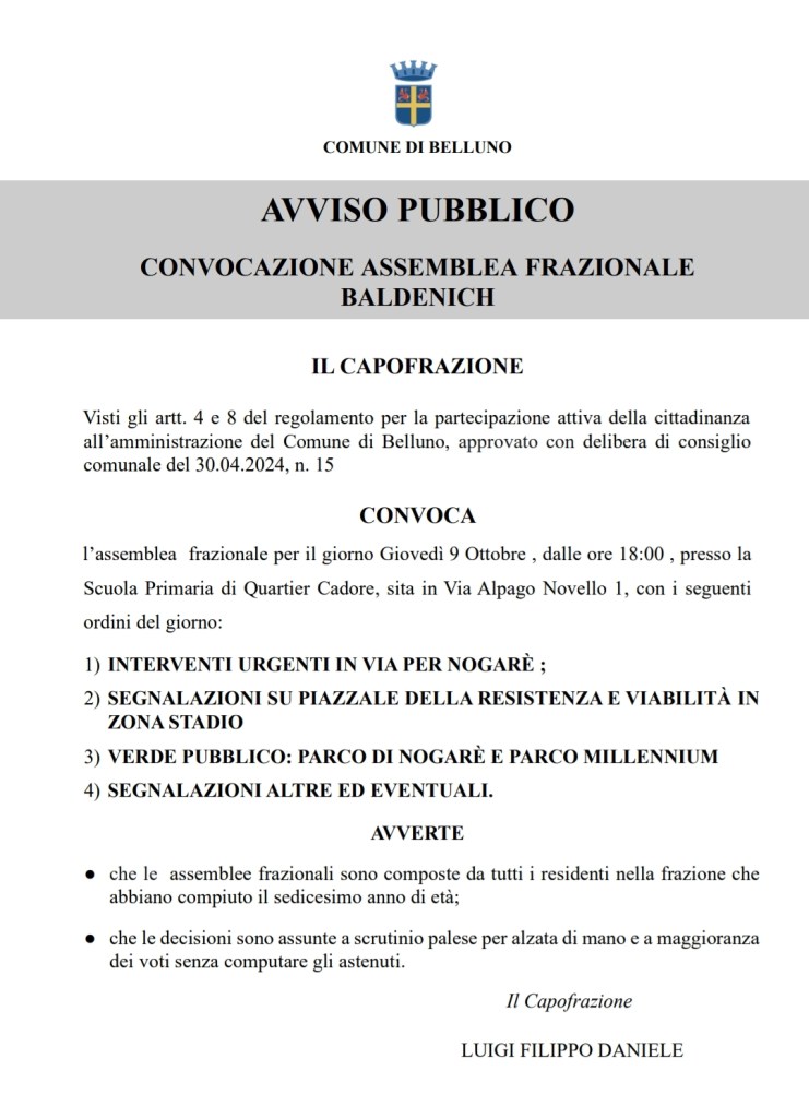 È prevista l’assemblea frazionale di Baldenich-Nogaré – Quartier Cadore per il giorno Giovedì 9 ottobre presso la scuola primaria di Nogarè in via Alpago Novello a partire dalle ore 18.00.