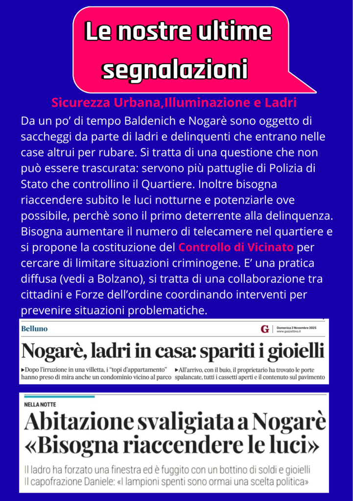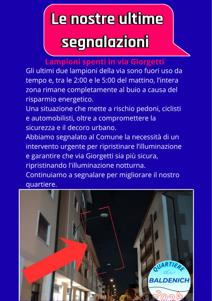 In via Giorgetti gli ultimi due lampioni sono spenti da tempo, lasciando la zona completamente al buio nelle ore notturne. Abbiamo chiesto al Comune un intervento urgente per ripristinare l’illuminazione e garantire sicurezza a pedoni e automobilisti. Allo stesso tempo, preoccupa la crescente ondata di furti che ha colpito Baldenich e Nogarè: servono più pattuglie e più luce nelle strade. Proponiamo inoltre l’attivazione di un sistema di Controllo di Vicinato, già sperimentato con successo in altre città.