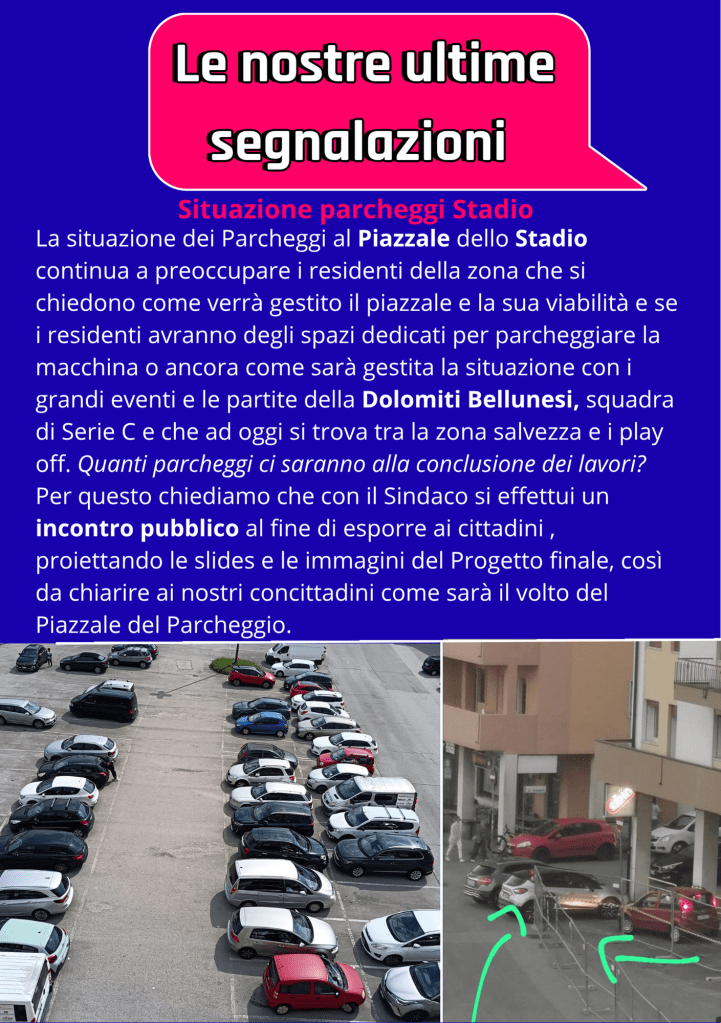 I lavori al Polisportivo e al Piazzale dello Stadio stanno creando grossi disagi a residenti e attività: gli stalli sono passati da 160 a circa 90 e manca chiarezza sul progetto finale. Chiediamo un incontro pubblico con il Sindaco per spiegare ai cittadini come sarà organizzata la viabilità e la gestione dei parcheggi, soprattutto durante eventi sportivi. A via Nogarè, invece, si continua a segnalare il problema delle auto che corrono troppo e della strettoia tra via Bettio e piazza Lollino. La nostra proposta è installare un semaforo intelligente per regolare il traffico e ridurre gli ingorghi.