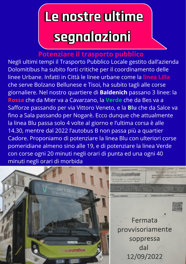 Negli ultimi mesi abbiamo inviato diverse comunicazioni al Comune di Belluno, tramite l’assessorato alle Frazioni e le assemblee frazionali, toccando i temi più sentiti dai cittadini: sicurezza, manutenzione, mobilità, verde pubblico e vivibilità. Il 7 novembre oltre al libricino di 12 pagine approvato dall’assemblea frazionale il 9 ottobre, porteremo all’attenzione del sindaco anche un opuscolo contenente 14 segnalazioni riguardanti i seguenti temi.