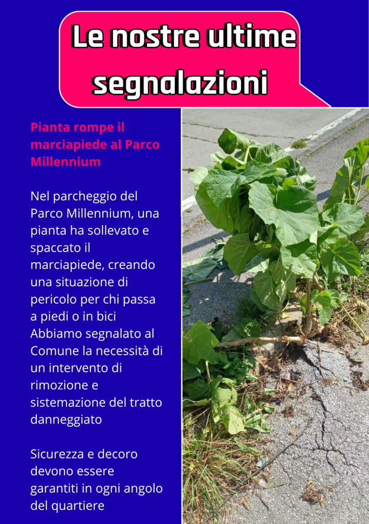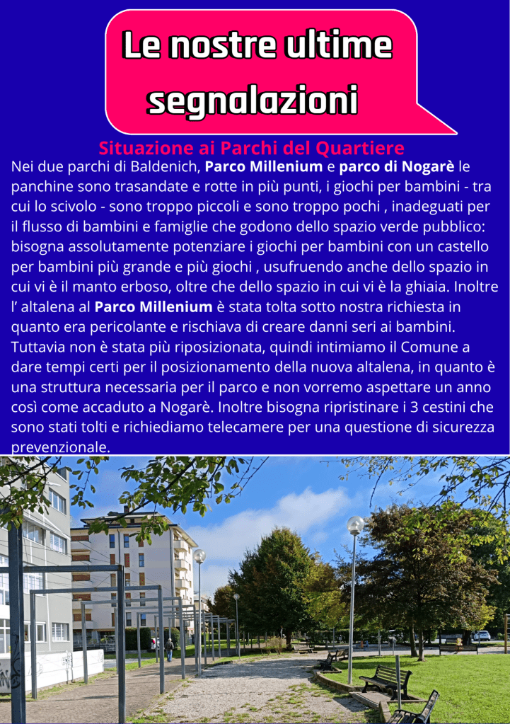 Il Parco Millennium e il Parco di Nogarè hanno bisogno di una seria manutenzione: panchine rotte, giochi insufficienti e altalene mancanti. Abbiamo chiesto tempi certi per il ripristino delle strutture, l’aggiunta di nuovi giochi e cestini, oltre all’installazione di telecamere per prevenire vandalismi.Nel Nel Parco Millennium, una pianta ha sollevato il marciapiede creando un rischio per pedoni e ciclisti: il Comune è stato avvisato per intervenire subito.