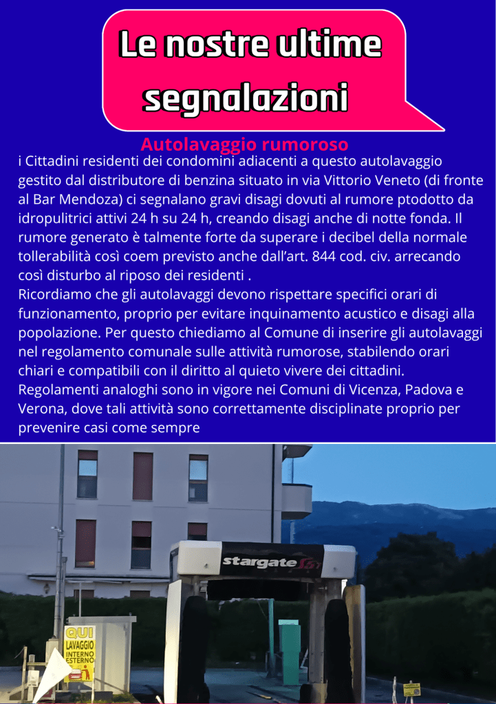 L’autolavaggio in via Vittorio Veneto, attivo 24 ore su 24, crea gravi disagi ai residenti per il rumore costante delle idropulitrici. Abbiamo chiesto che il Comune inserisca regole chiare sugli orari di attività rumorose, come già avviene in molte città venete.