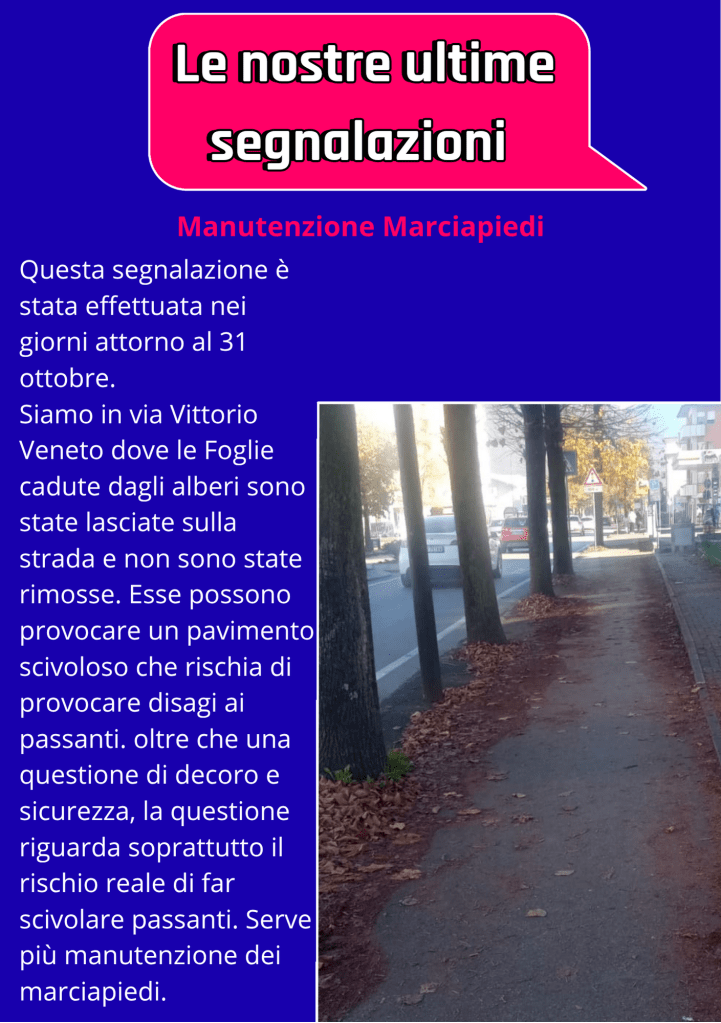 Inoltre, le foglie non raccolte in via Vittorio Veneto e lungo i marciapiedi creano situazioni scivolose e pericolose: servono più manutenzione e pulizia regolare.