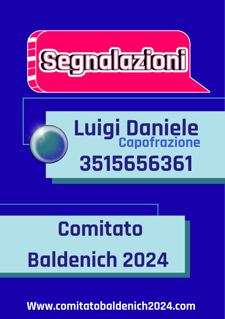 💬 Il Comitato Baldenich24 continuerà a segnalare, proporre e monitorare ogni situazione che riguarda la sicurezza, il decoro e la vivibilità del quartiere.Chiunque voglia segnalare un problema o contribuire con idee può scriverci direttamente dal sito o contattare il capofrazione Luigi Daniele – 351 5656361.