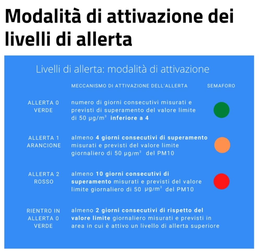Se si arriva all’arancione vuol dire che per almeno 4 giorni consecutivi il limite di legge dei PM10 (50 µg/m³) è stato superato.